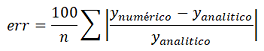 Al tomar valores de más pequeños, los valores de posición se acercan aún más al obtenido mediante la expresión analítica (salvo que los ya sean tan pequeños que haya errores cuando la computadora deba redondear en cifras tan chicas). Para analizar cómo difieren los resultados obtenidos mediante la expresión analítica y el algoritmo implementado, calculamos el error porcentual promedio de cada simulación realizando