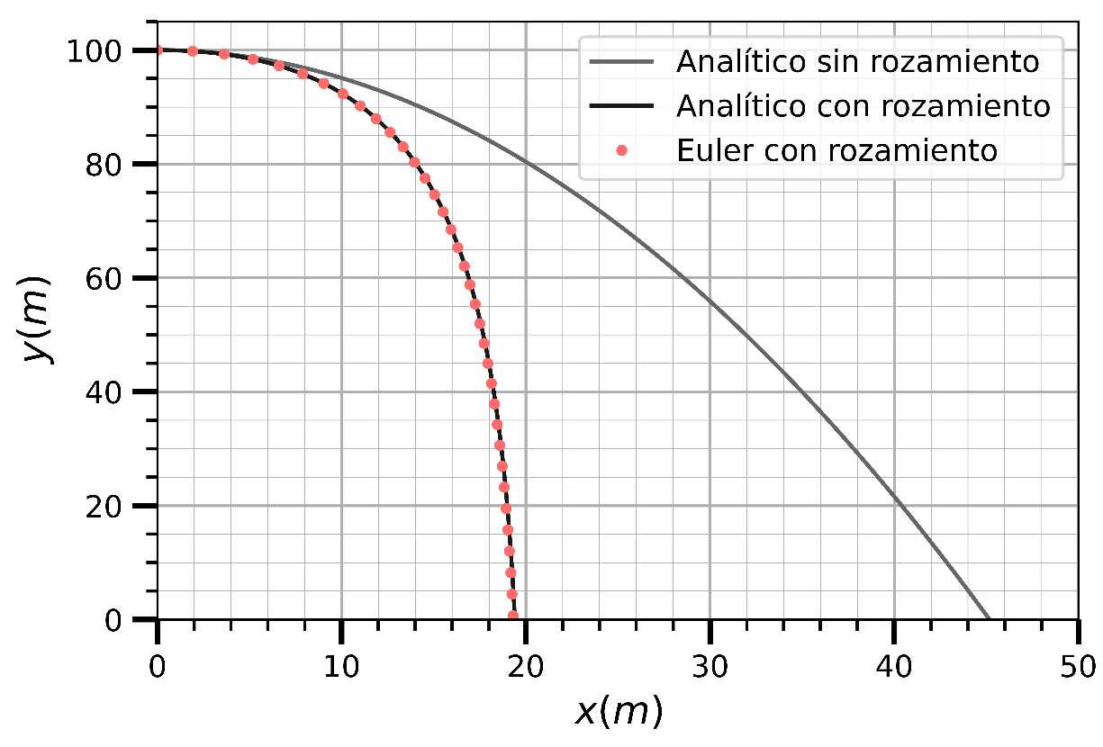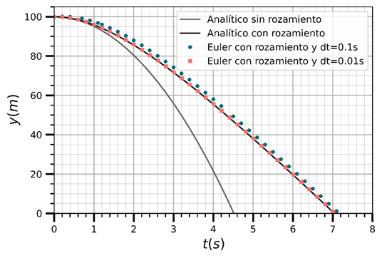 En este ejemplo nuevamente se obtienen prácticamente los mismos resultados mediante el programa desarrollado que con la expresión analítica obtenida bajo la resolución de ecuaciones diferenciales. Esta vez la perspectiva computacional no solo nos permitió llegar a una solución sin tener que trabajar con un formalismo matemático muy complejo para hallar las posiciones en cada instante de tiempo, también nos permitió conocer la trayectoria del objeto sin tener que realizar ningún esfuerzo extra. A su vez, una pequeña modificación a este programa permite estudiar situaciones nuevas, para las que no hay una expresión analítica general, como la caída con rozamiento proporcional al cuadrado de la velocidad.