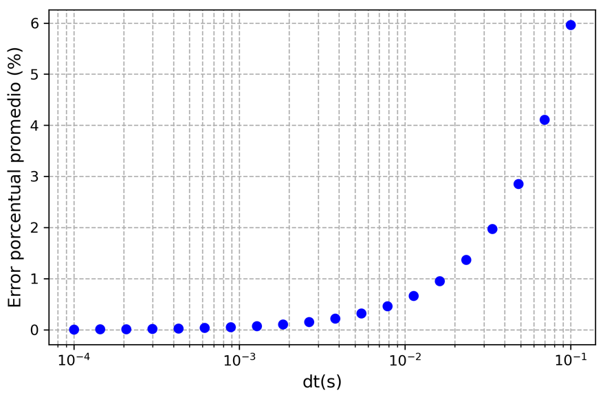 La Figura 2 muestra el error porcentual promedio de distintas simulaciones en función del valor de elegido. Se puede observar que para valores de menores a 0,01s el error promedio ya es menor al 1%.