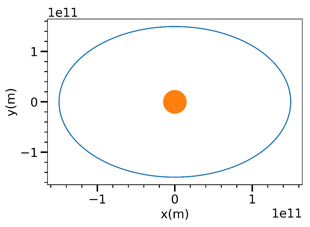 Para visualizar la validez de este método para el estudio del movimiento de los planetas, creamos un programa en Python en el que se implementa el algoritmo. Consideramos a la Tierra ubicada en la posición inicial m, que es su distancia media al Sol, con , y con una velocidad inicial perpendicular a la recta que la une con el Sol m/s. Implementamos el algoritmo para dt=10s hasta llegar a 1 año, y el código del programa es el siguiente:
