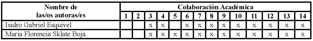 1- Administración del proyecto; 2- Adquisición de fondos; 3- Análisis formal; 4- Conceptualización; 5- Curaduría de datos; 6- Escritura – revisión/edición; 7- Investigación; 8- Metodología; 9- Recursos; 10- Redacción – borrador original; 11- Software; 12- Supervisión; 13- Validación; 14- Visualización.